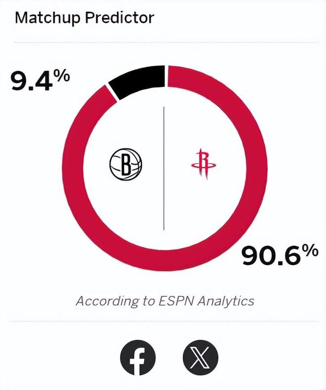 ESPN预测火箭在对阵篮网这场比赛时赢球概率高达90.6%,而来访的篮网只有9.4%,拿到这场胜利后乌度卡应该能松口气吧。